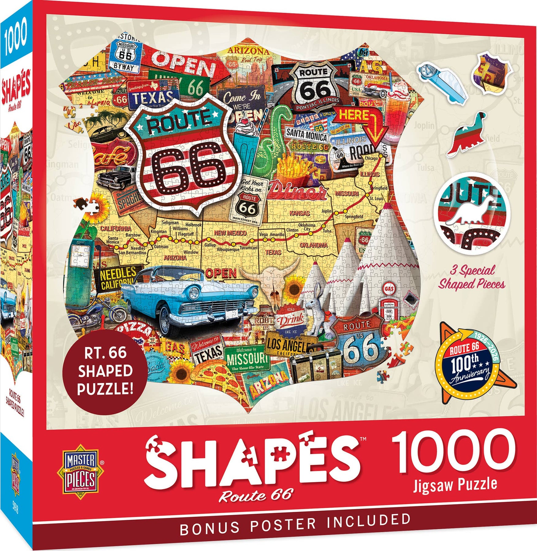 Get ready to embark on a nostalgic journey across America's most iconic highway with our Route 66 shaped puzzle! This vibrant 1000-piece puzzle celebrates the legendary road trip, featuring colorful roadside signs, classic cars, and iconic landmarks from coast to coast. Shaped like the iconic Route 66 shield, this puzzle takes you through the heart of the United States, from the deserts of Arizona to the shores of California, with vintage flair that will have you dreaming of diner stops and endless highways. Perfect for puzzle enthusiasts and lovers of American road trip history, this shaped puzzle offers a unique and exciting challenge. Every piece reveals a new destination along the "Mother Road," complete with retro diners, motels, gas stations, and landmarks that defined a generation of travelers. The bold colors and detailed artwork make this puzzle a joy to assemble, and its distinctive shape adds an extra layer of fun. Whether you're a seasoned puzzler or just looking for a piece of Americana to enjoy,