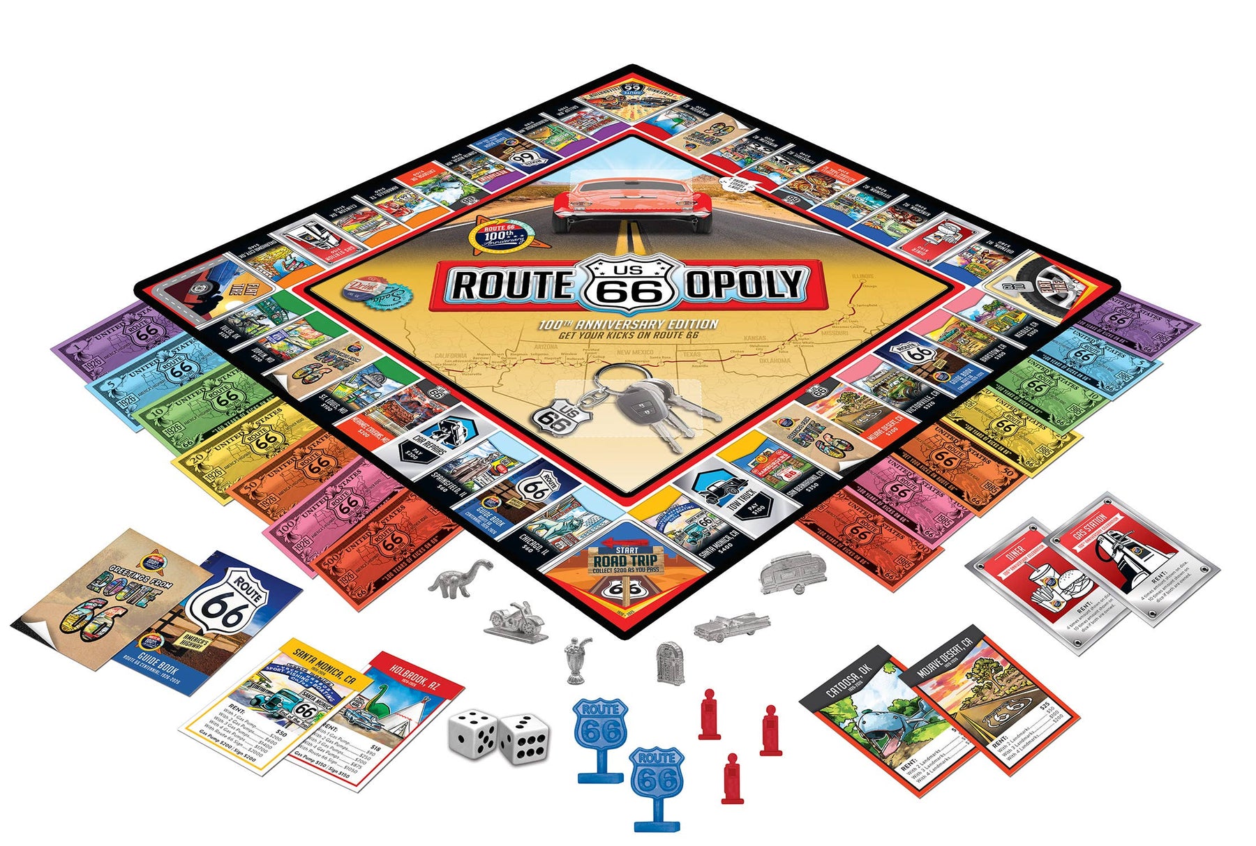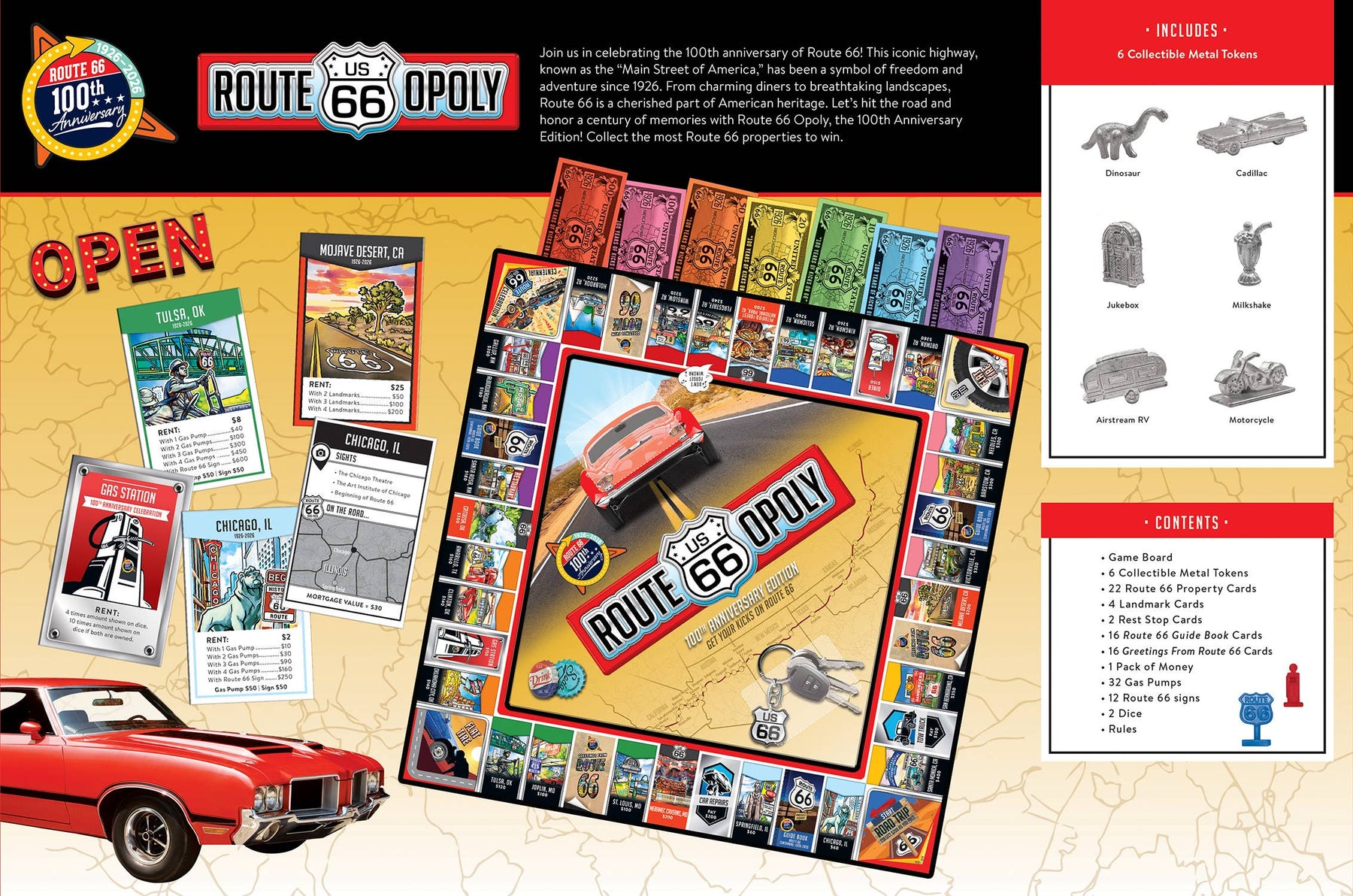 Get your kicks on Route 66 as you travel America's Mother Road visiting all the most iconic stops, with Route 66 Opoly! Play on an authentic, retro style game board featuring throwbacks to Route 66's funky architecture, tasty diners, and wacky sights. Learn fun facts about each historic landmark along the way. Collect the most Route 66 properties to win! This game comes with 6 Collectible Tokens, 22 Route 66 Property Cards, 4 Landmark Cards, 2 Rest Stop Cards, 16 Route 66 Guide Cards, 16 Greetings from US 66 Cards, a packet of money, 32 Gas Pumps, 12 Route 66 Signs, 2 dice, and game instructions. Each of the cards comes with unique trivia.