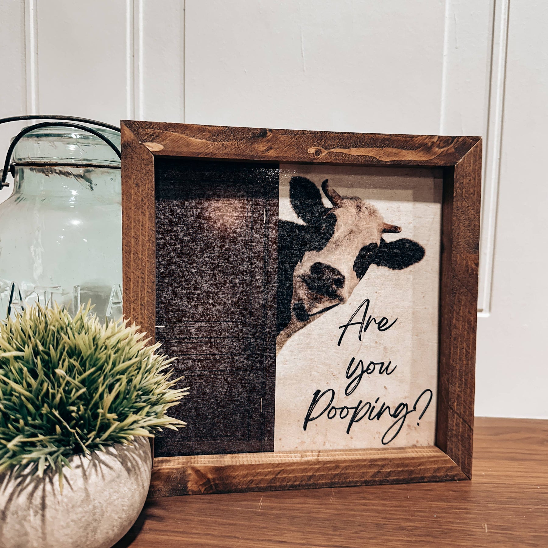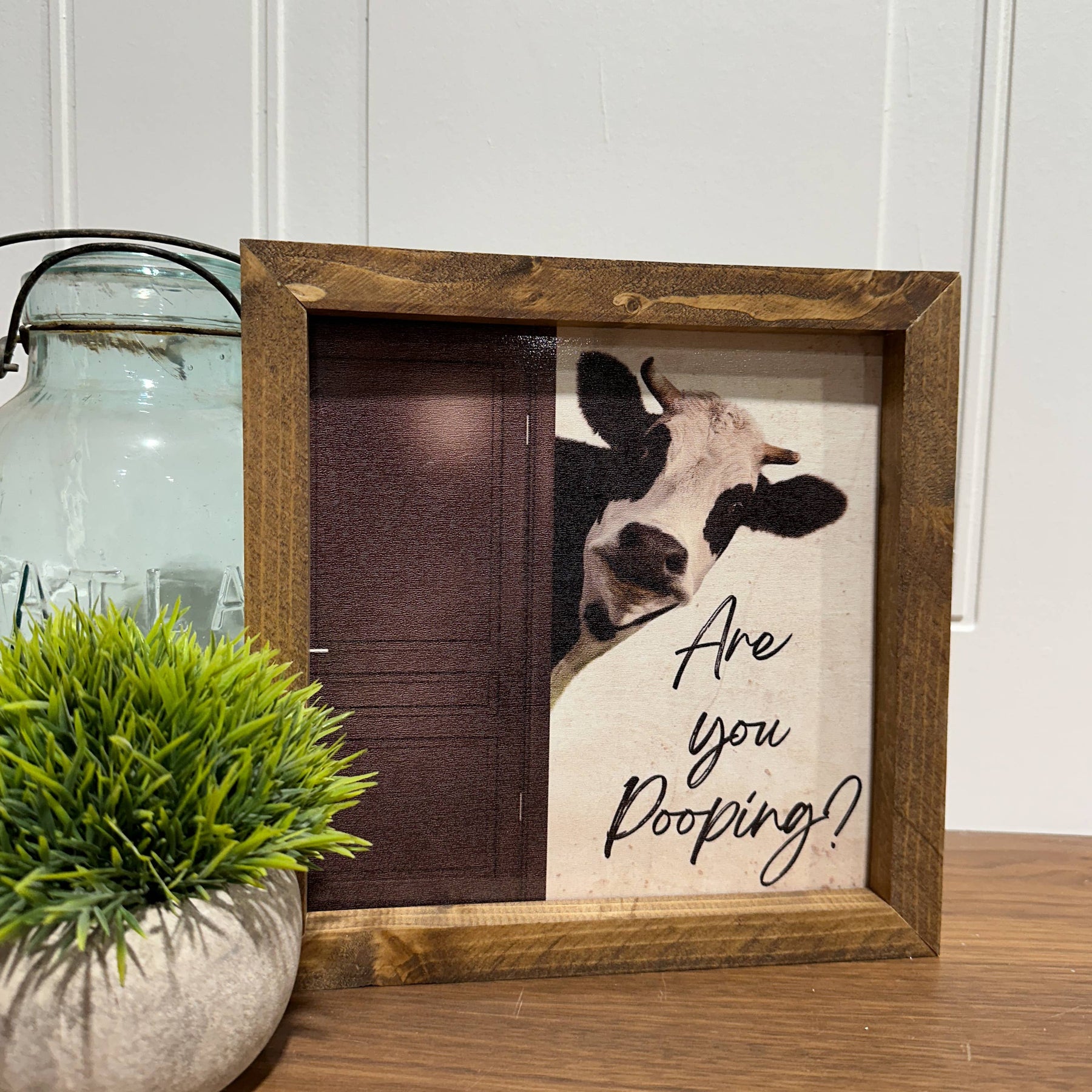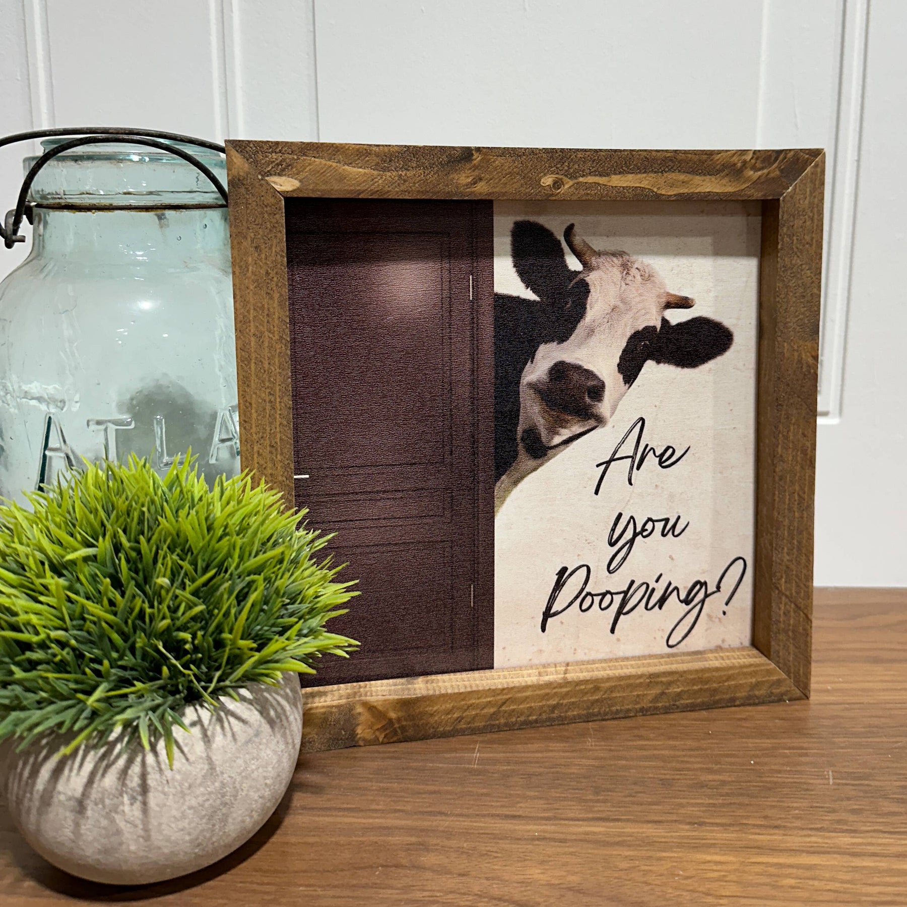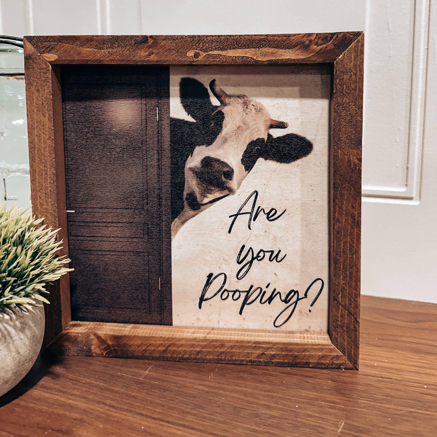 Funny Bathroom sign with cow. "Are you pooping" funny minimalist bathroom decor, toilet humor. Each piece that we offer is made from start to finish in our Kansas shop. The 8x8 photo is perfect to add to a shelf or an addition to a small grouping.