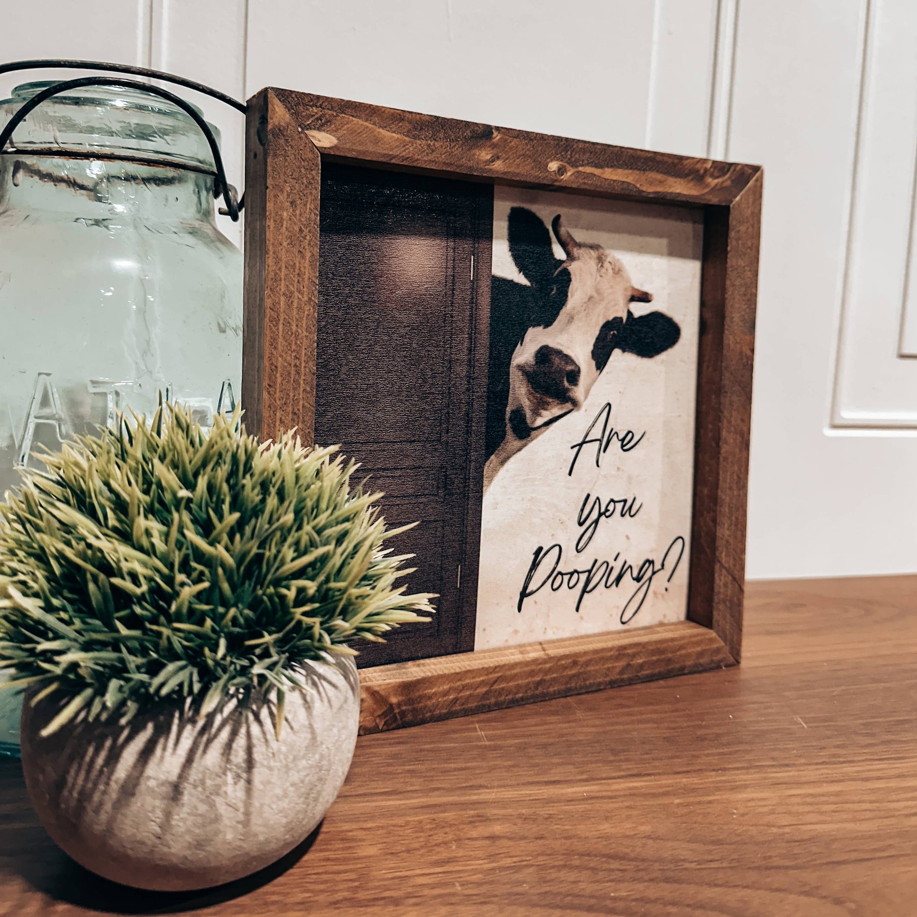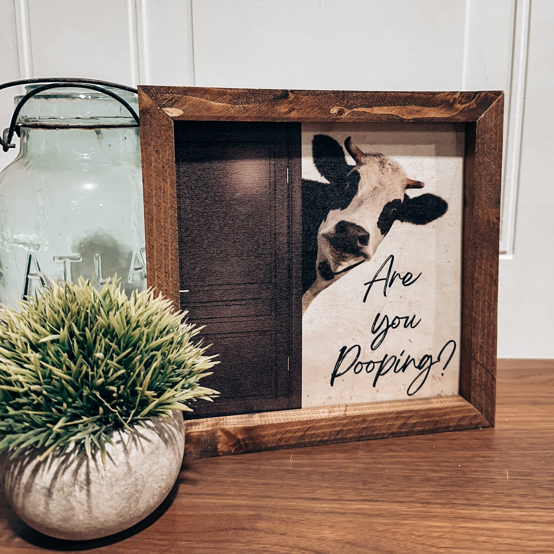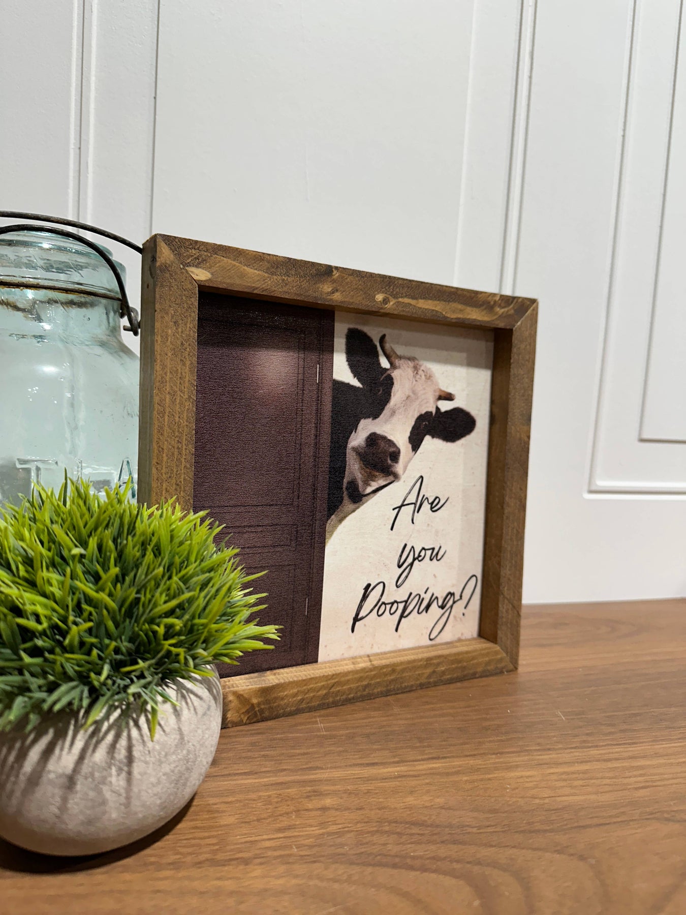 Funny Bathroom sign with cow. "Are you pooping" funny minimalist bathroom decor, toilet humor. Each piece that we offer is made from start to finish in our Kansas shop. The 8x8 photo is perfect to add to a shelf or an addition to a small grouping.