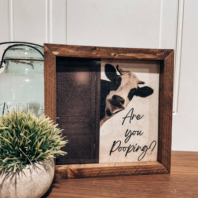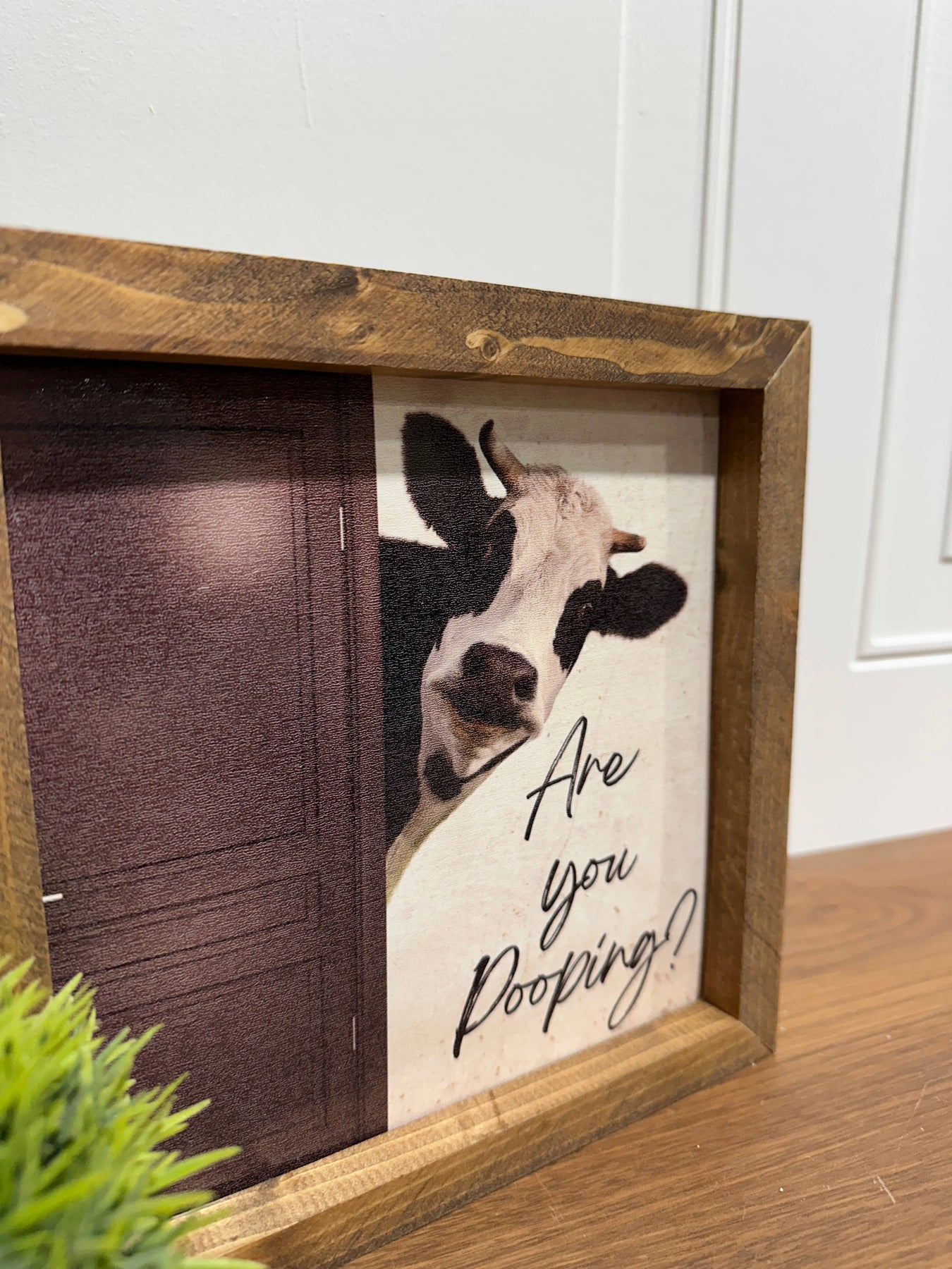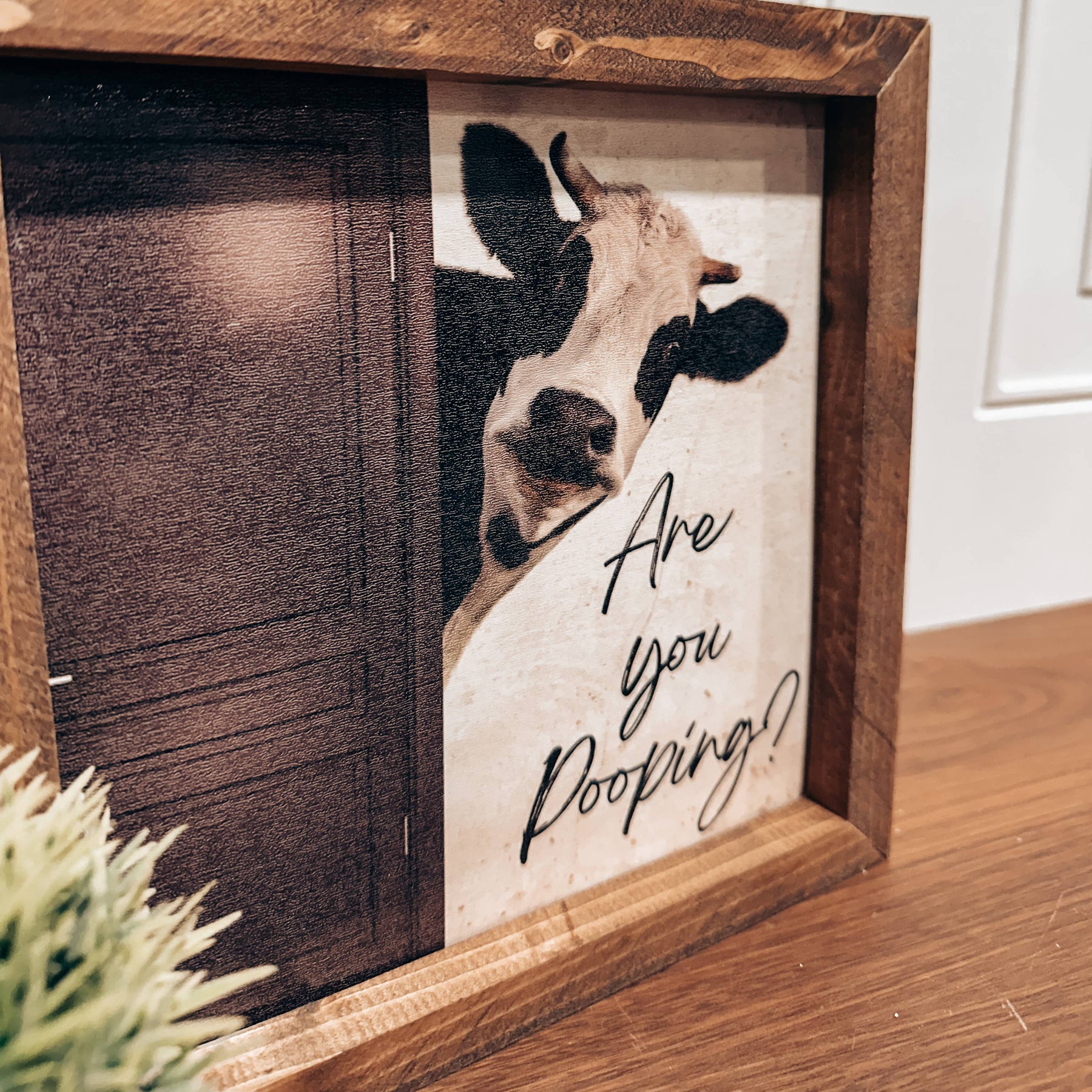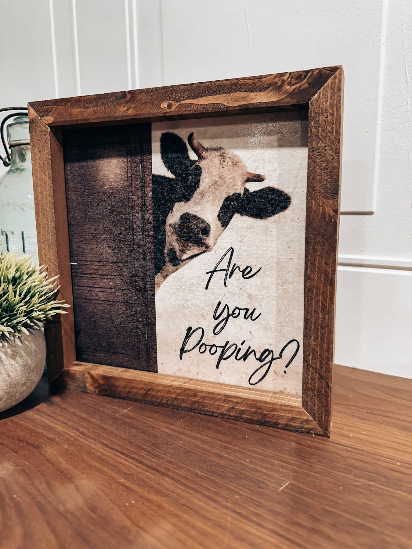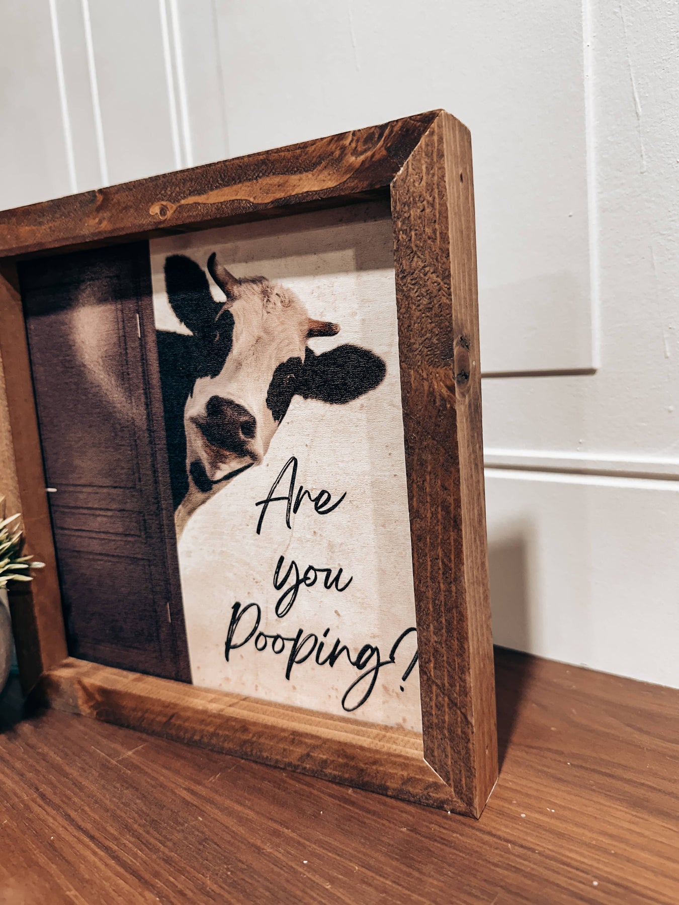 Funny Bathroom sign with cow. "Are you pooping" funny minimalist bathroom decor, toilet humor. Each piece that we offer is made from start to finish in our Kansas shop. The 8x8 photo is perfect to add to a shelf or an addition to a small grouping.